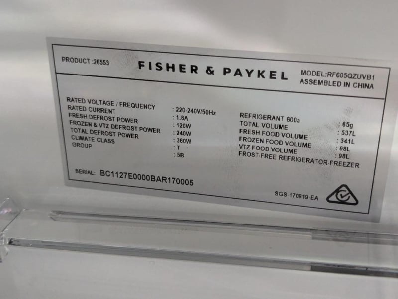 RRP: $4399, Fisher and Paykel 538L Series 7 Quad Door Refrigerator Freezer, Model: RF605QZUVB1, S/N: BC1127E0000BAR170005