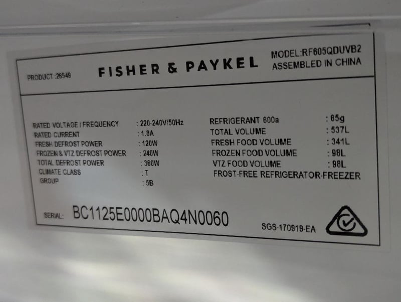 RRP: $3999, Fisher and Paykel 538L Series 7 Quad Door Refrigerator Freezer, Model: RF605QDUVB2, S/N: BC1125E0000BAQ4N0060