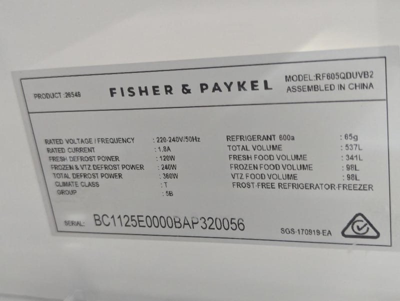 RRP: $3999, Fisher and Paykel 538L Series 7 Quad Door Refrigerator Freezer, Model: RF605QDUVB2, S/N: BC1125E0000BAP320056