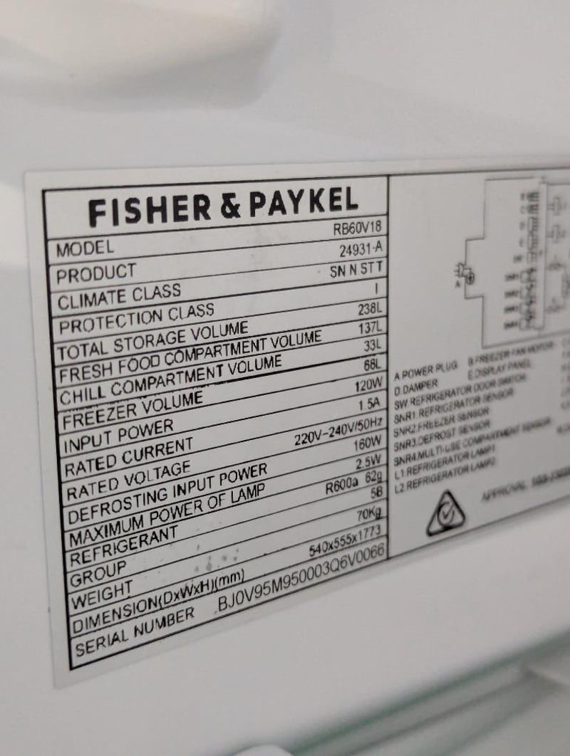RRP$2799, Fisher & Paykel Series 5 236L Integrated Bottom Mount Refrigerator Model: RB60V18, S/n: BJ0V95M950003Q6V0066
