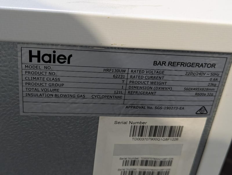 RRP: $459, Haier 121L 300 Series Bar Refrigerator, Model: HRF130UW, S/N: TD003707900Q1Q8F1226Dimensions: Height 828mm x Width 495mm x Depth 560mm
