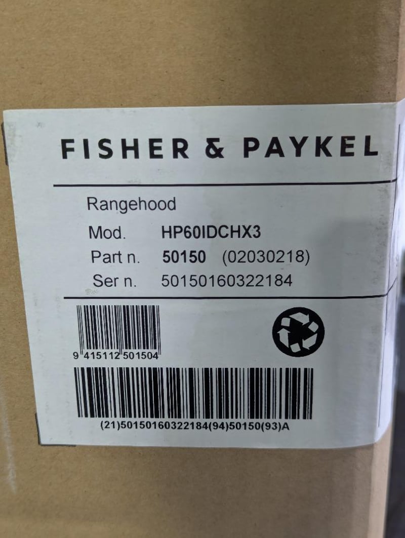 RRP: $1299 Fisher & Paykel Series 7 60cm Integrated Insert Wall Rangehood Stainless Steel Model No: HP60IDCHX3, Serial: