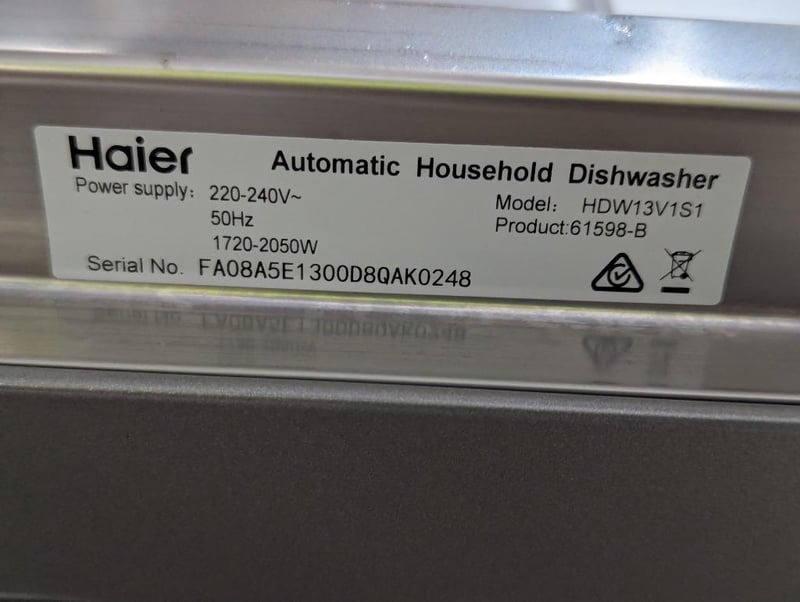 RRP: $659, Haier 300 Series Freestanding Dishwasher, Model: HDW13V1S1, S/N: FA08A5E1300D8QAK0248