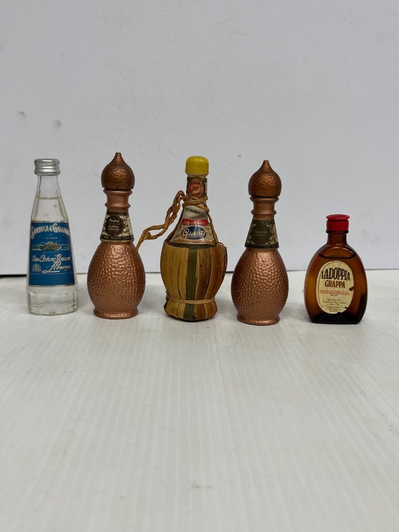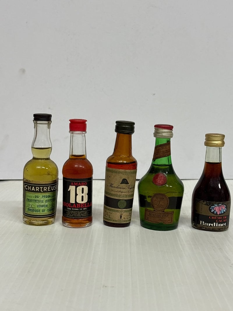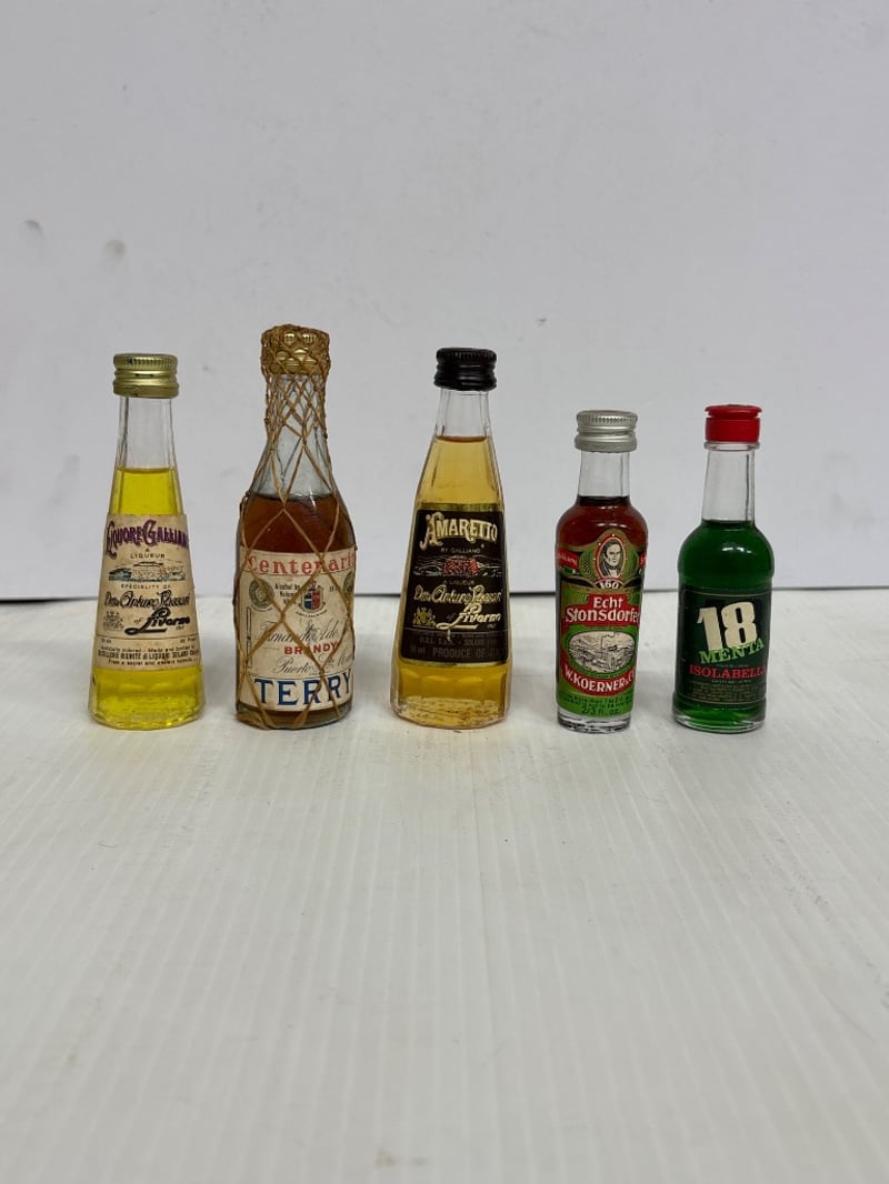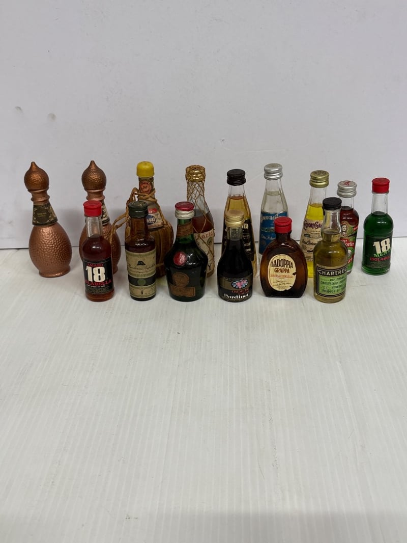 Assorted lot of miniature Liqueur bottles, includes Sambuca Di Galliano, Amaretto, Turkish coffee liqueur and more, qty 15 Sold as lot