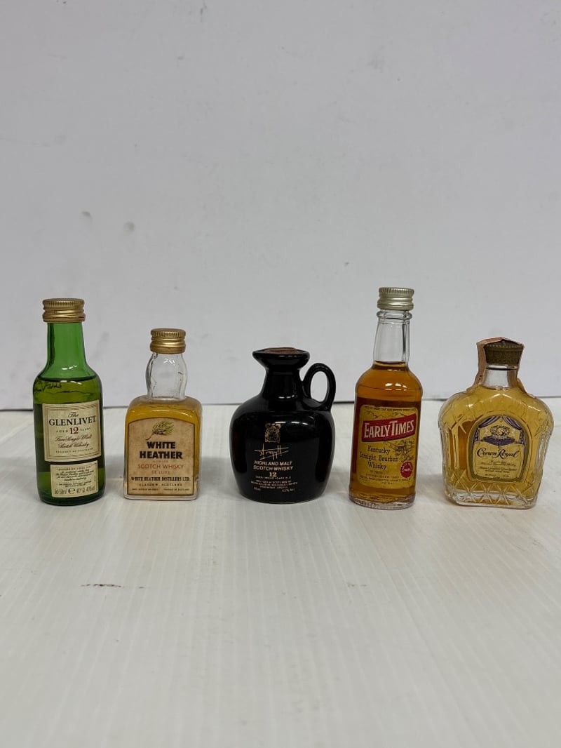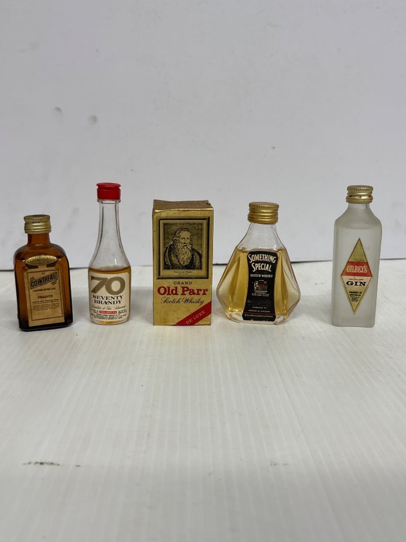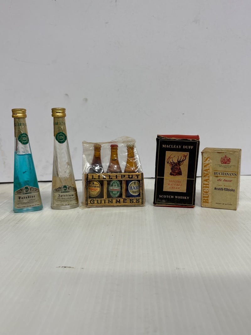 Assorted lot of miniature liqueur bottles, including Gin, Scotch Whisky, Guinness and more, qty 15 Sold as lot