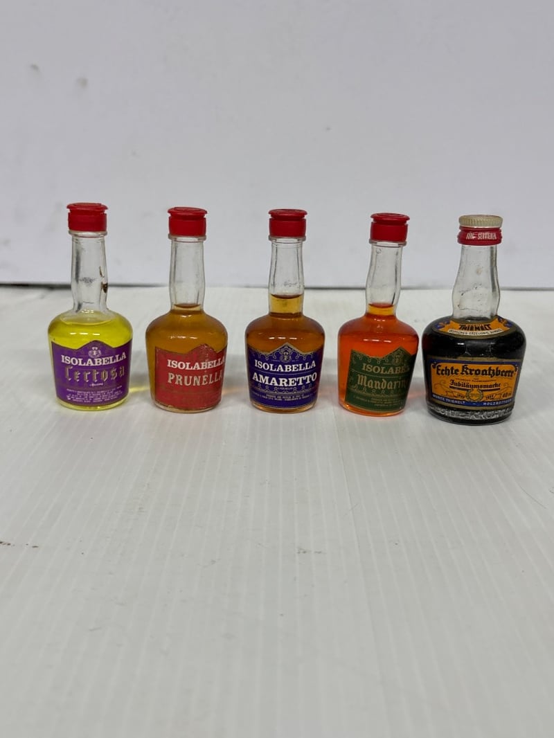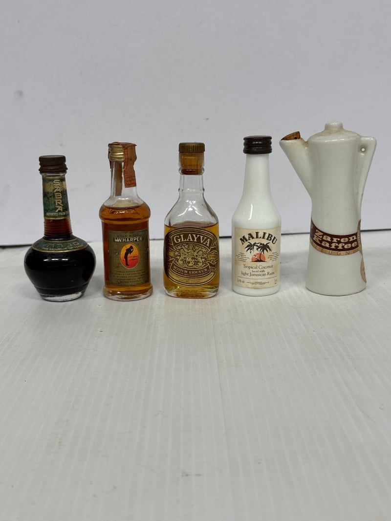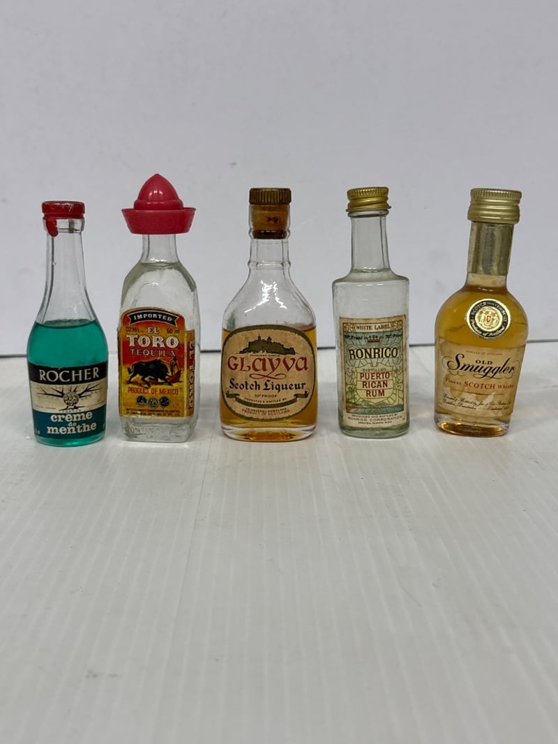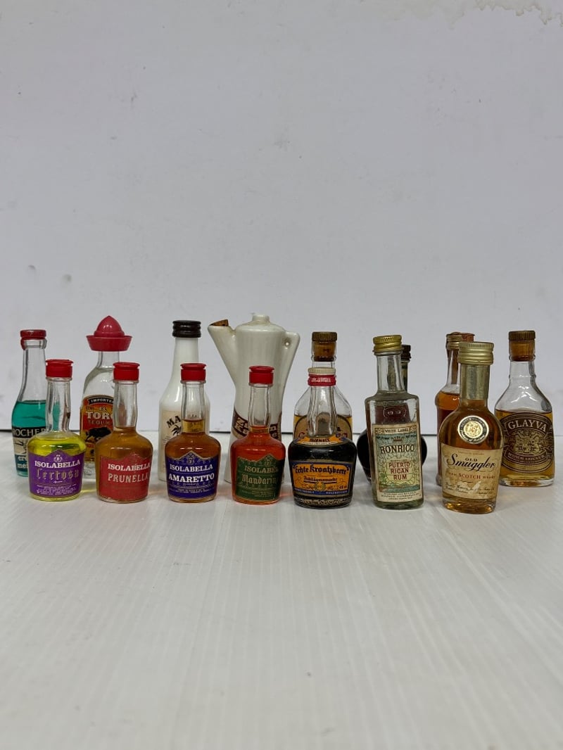 Assorted lot of miniature liqueur bottles, including Okd Smuggler Scotch, El toro Tequila, Malibu and more, qty 15 Sold as lot