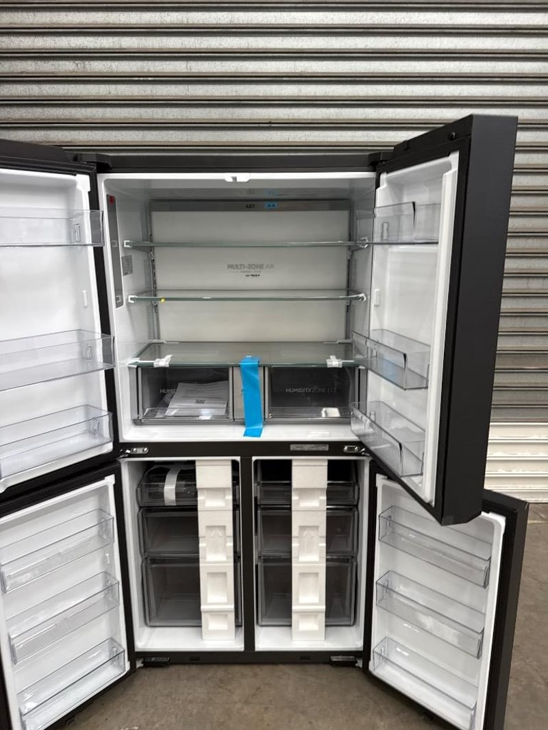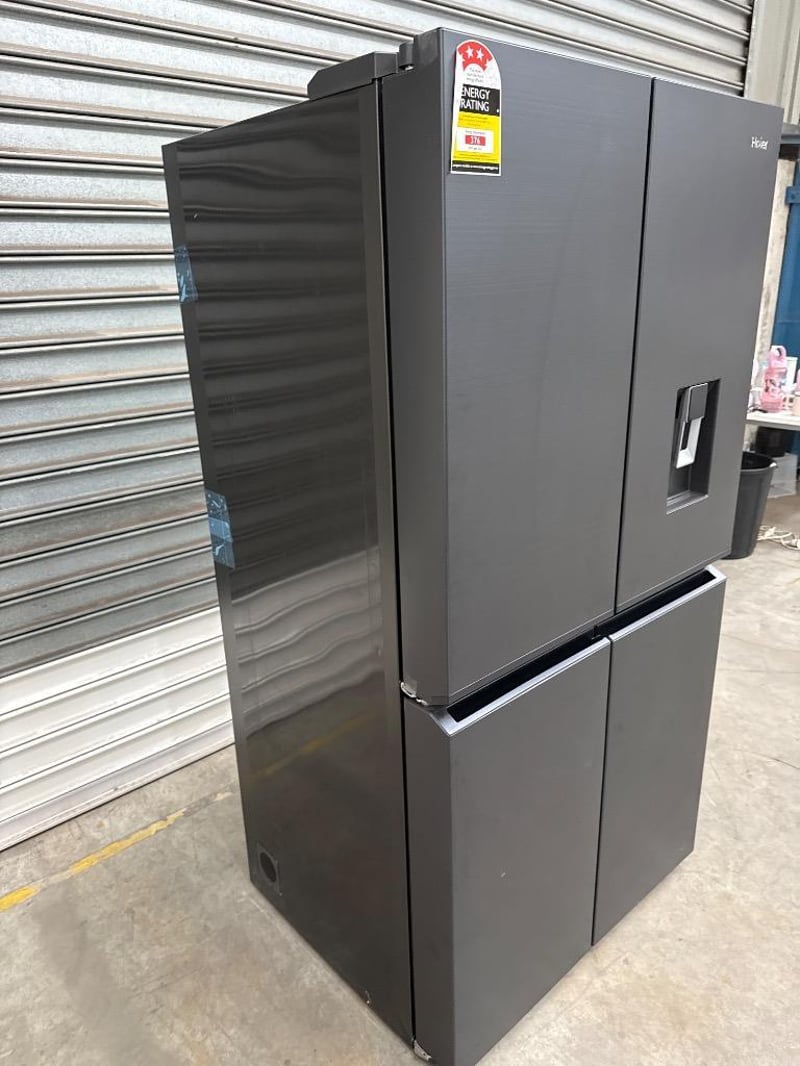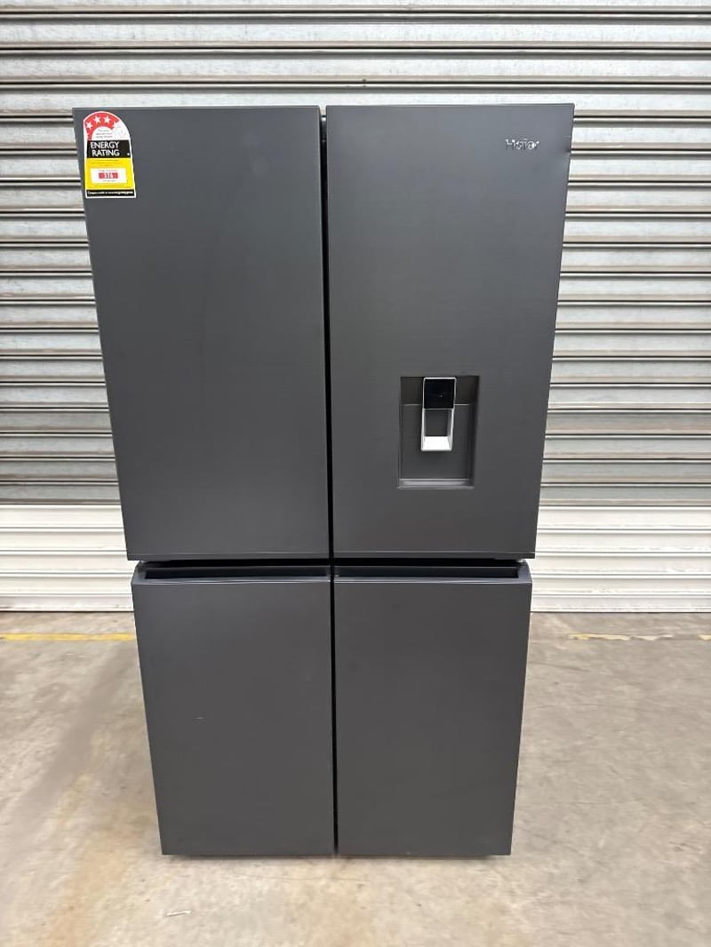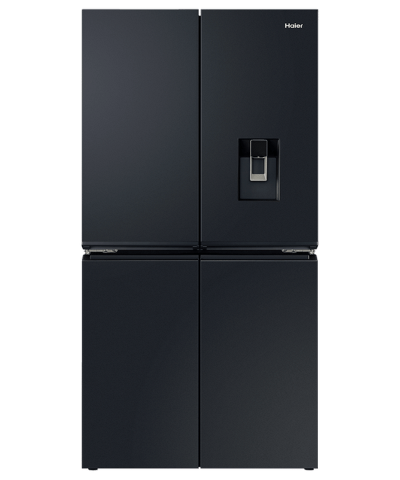 RRP $ 2,999, Haier 623L 600 Series Quad Door Refrigerator Freezer dimensions; H1775mm x W908mm x D750mm model; HRF680YPC features; black finish
