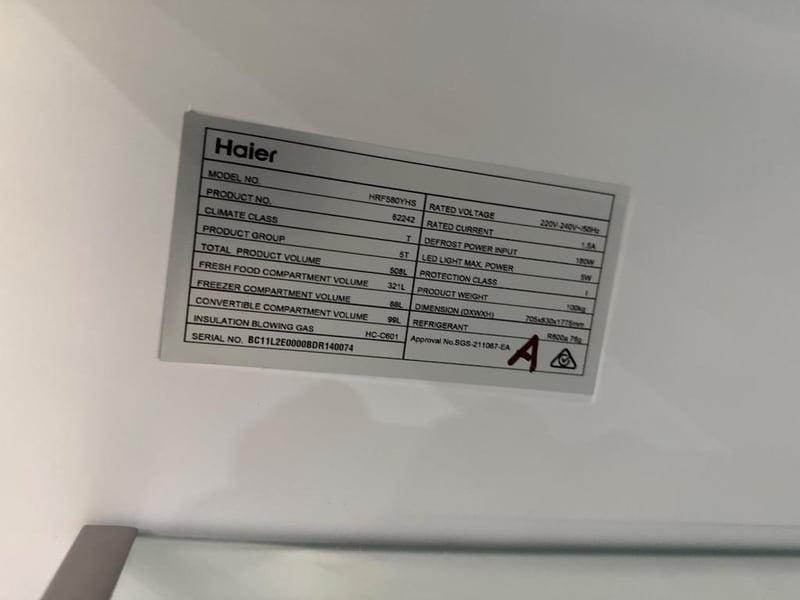 RRP; $2,099, Haier 508L 600 Series Quad Door Refrigerator Freezer dimensions; H1775mm x W830mm x D705mm Model; HRF580YHS Features; satina finish, french hinged