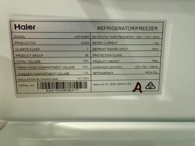 RRP; $1099, Haier 433L 500 Series Refrigerator Bottom Freezer Dimensions; H1725mm x W700mm x D675mm Volume freezer; 112L Volume refrigerator; 321L Features; Adjustable glass shelves, Door alarm, Fingerprint resistant finish Model; HRF420BS