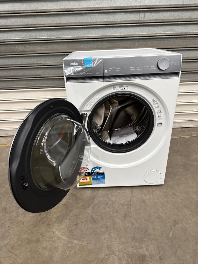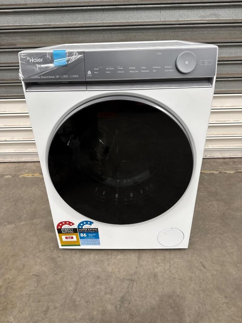 RRP; $ 999, Haier 10kg 500 Series Front Loader Washing Machine Dimensions; H850mm x W595mm x D593mm Model; HWF10NW1 features; white finish, 10kg capacity
