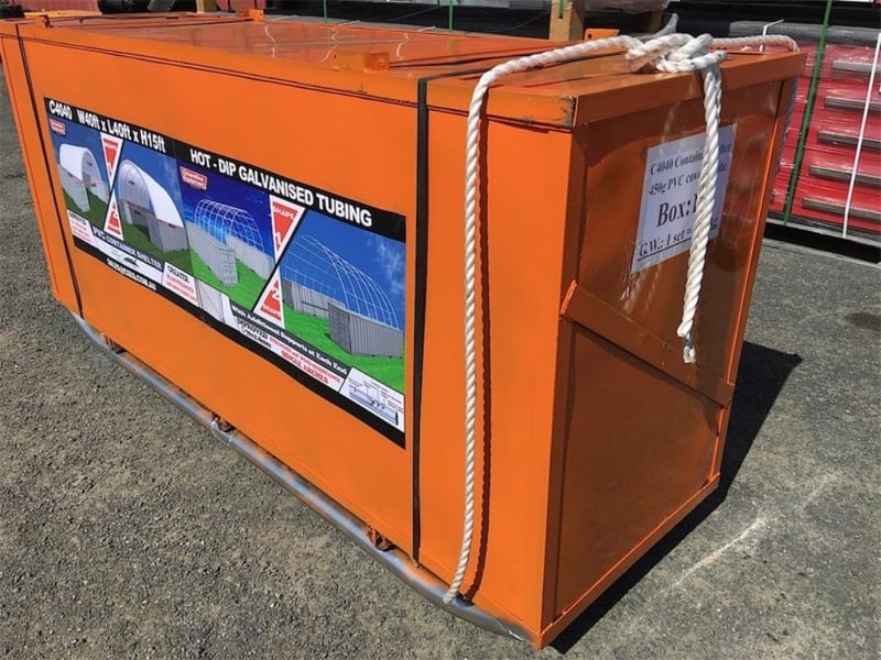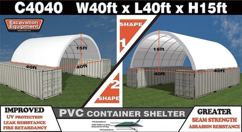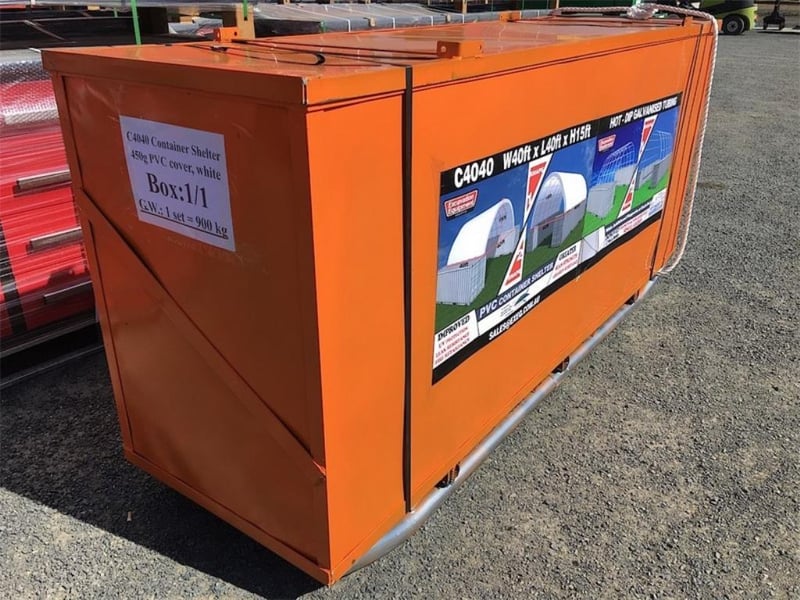 Unused Heavy duty 40ft Container Shelter, Model: C4040, 40ft wide x 40ft long x 15ft High, Heavy duty PVC fabric, galvanised tube frame, Approximate Shipping Dimensions: 2440mm L x 740mm W x 1150mm H, Approximate Weight: 900kgRef: 166920Location: Dubbo, NSW