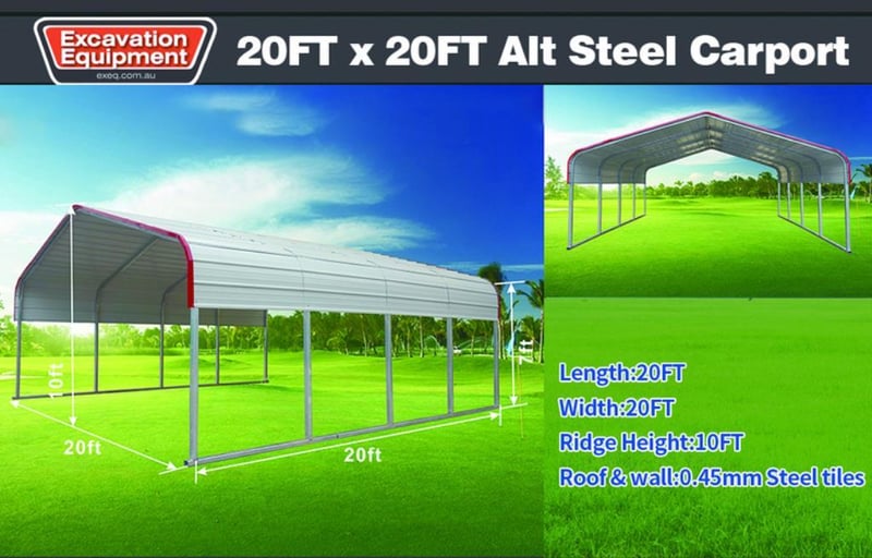 Unused 20ft x 20ft Steel Carport, 20ft Long x 20ft Wide x 10ft High, Approximate Shipping Dimensions : 2220mm L x 1130mm W x 430mm H, Approximate Weight: 550kgRef: 166974Location: Dubbo, NSW