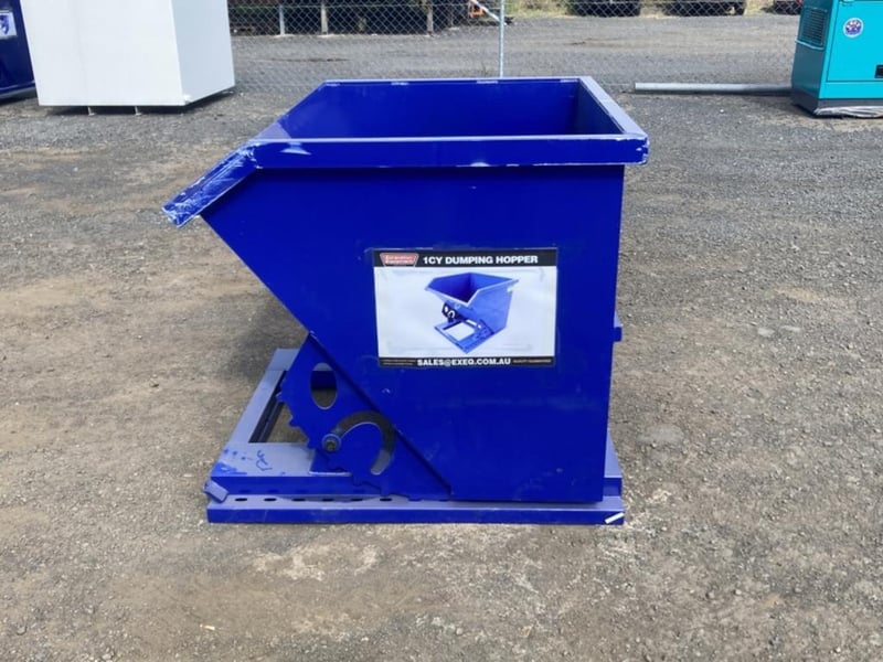 Unused Self Tipping Skip Bin / Hopper, To Suit Forklift, Capacity: 1 Cubic Yard, Fork Pockets, Approximate Dimensions at Top of Skip: 1100mm x 1070mm, Approximate Shipping Dimensions: 1100mm L, 1100mm W, 1040mm H, Approximate Weight 135kg