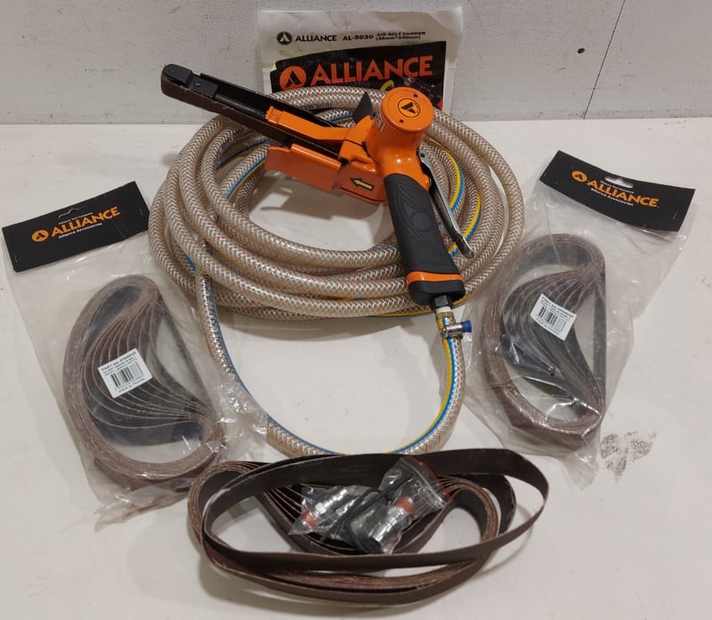 Alliance air belt sander includes a few packs of Grit abrasive belts.Sold as a lot.Notes: item untested and signs of wear.