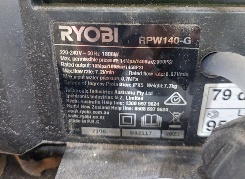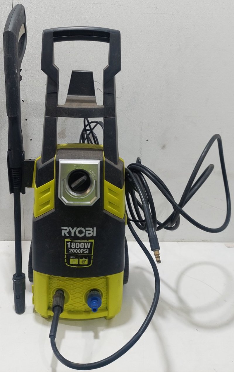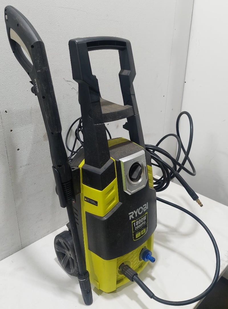Ryobi 1800W 2000PSI electric pressure washer. Model: RPW140-G Serial number: 21060321172021 Note: item is untested, signs of wear.