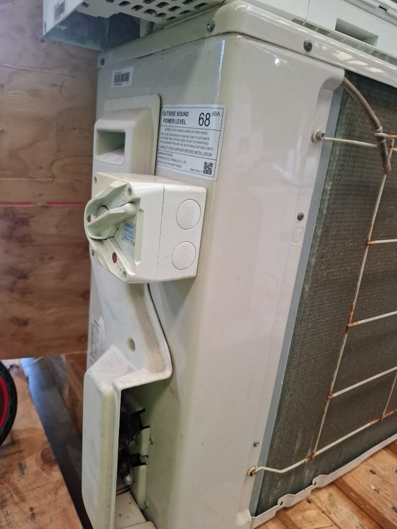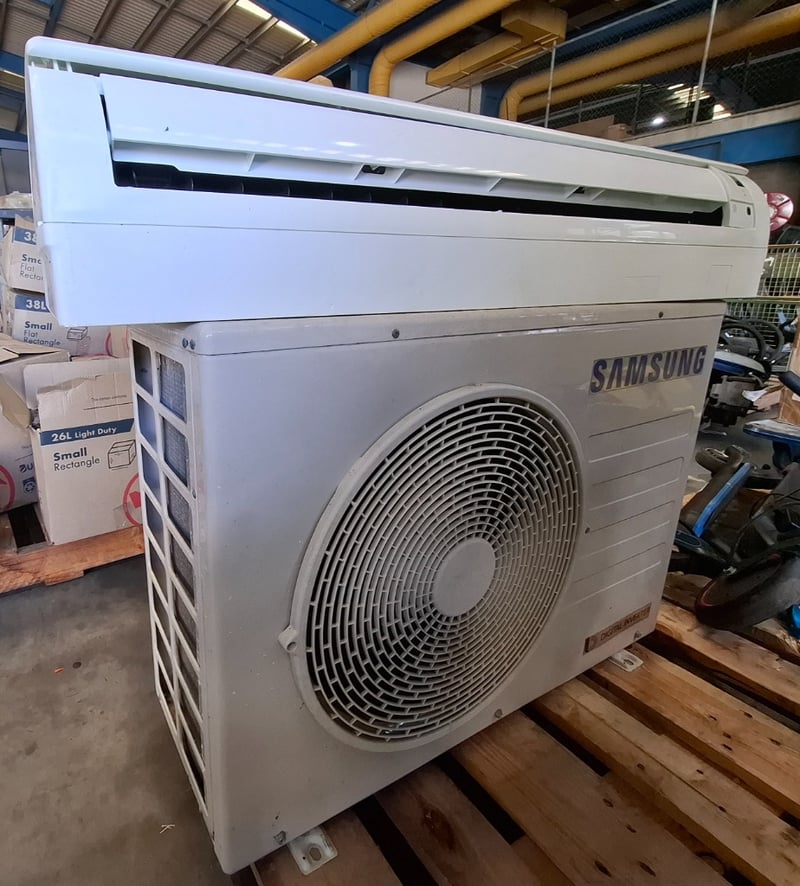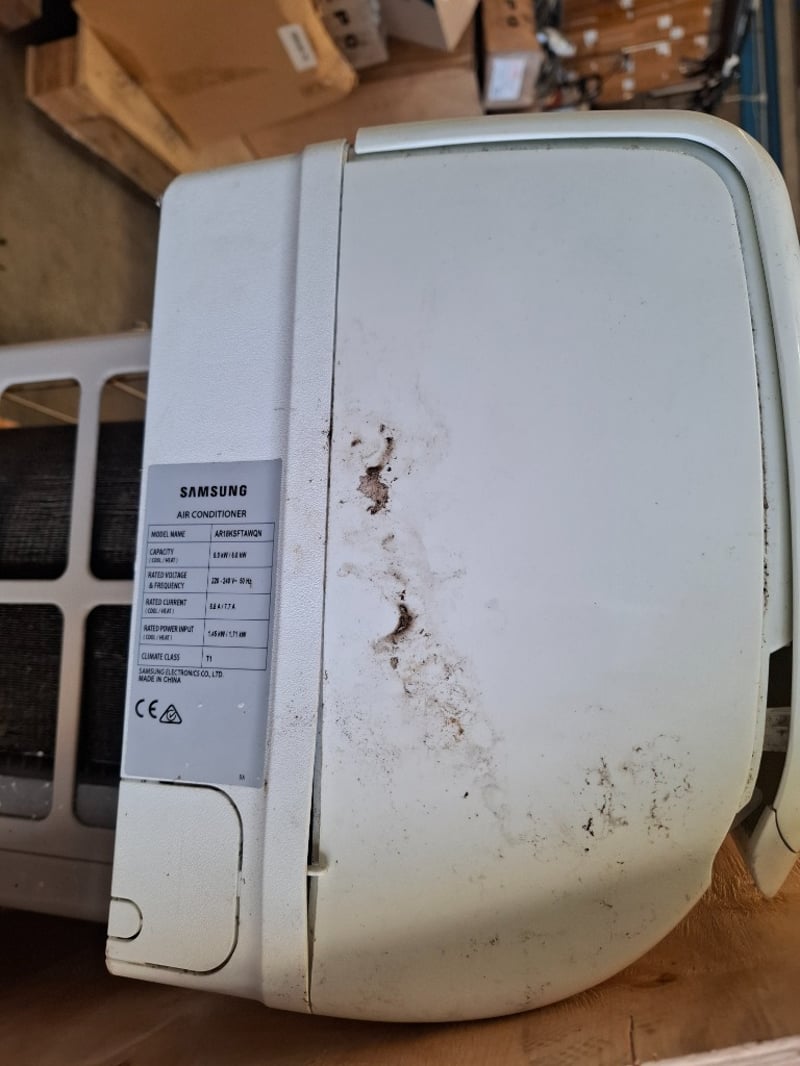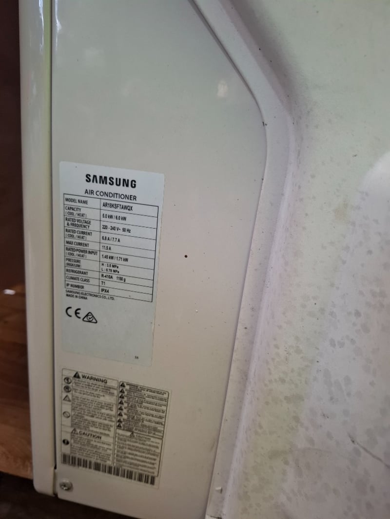Air conditioner Make: Samsung Indoor model: AR18KSFTAWQNOutdoor model: AR18KSFTAWQXDimensions: indoor 105 cm( (W)x 30 cm( H) x 22cm ( D)Outdoor 96 cm( (W)x 65 cm( H) x 36cm ( D)Description/extras: Power supply 220-240V-/ 50 Hz, refrigerant R410A 11500g, includes both unit Indoor and outdoor, used , cleaning required