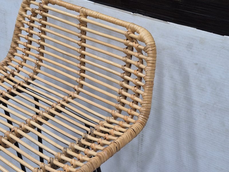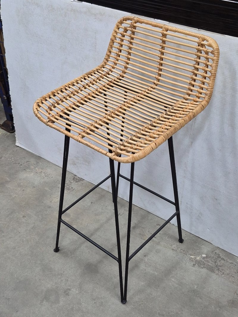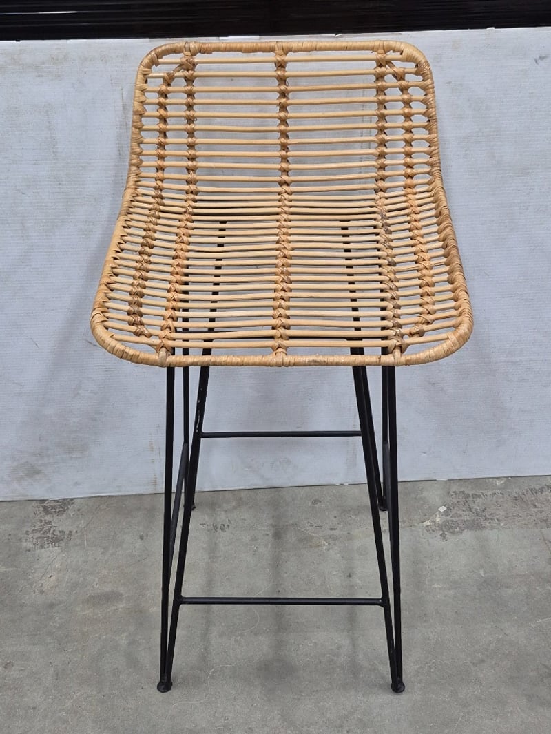 Outdoor Bar Stools, Wooden Rattan, Black Metal Frame,
