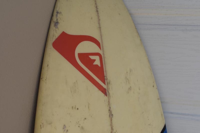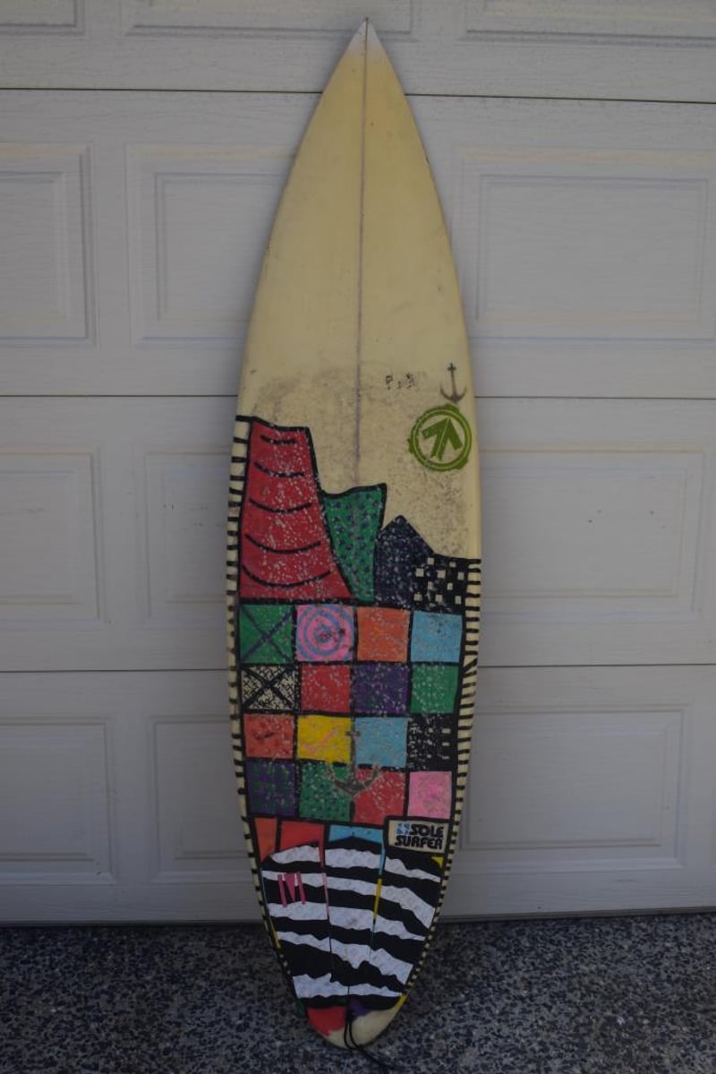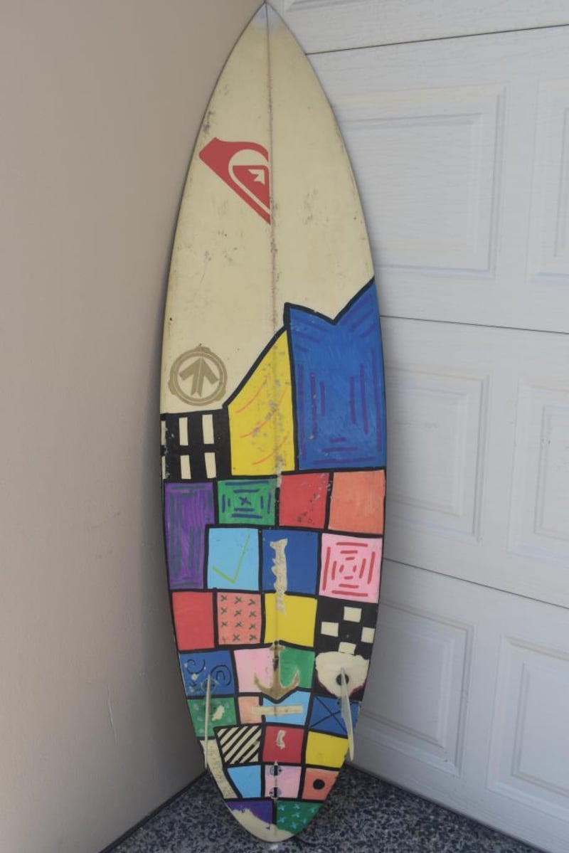 6'1 Quicksilver Surfboard, with grip pad, colourful design, good condition.