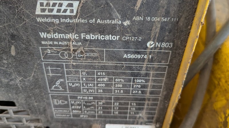 WIA Fabricator Weldmatic, Model: CP127-2 with W61 Wirefeeder, With Wheels, 3 Phase PowerLocation: Tomago, NSW Inspection: Thursday the 12th of March, 10am to 3pm & Friday the 13th of March, 8am to 3pm Collection: Monday the 23rd of March 10am to 3pm & Tuesday the 24th to Friday the 27th of March, 8am to 3pm. Contact: Gage Mackay on 0458 732 549 or [email protected] ** Important Notice to Buyers ** Customers MUST sign in on site for inspections and collections and must adhere to the safety guidelines of the site Site safety gear is mandatory for all visitors: this includes a high-visibility top, and steel cap boots. The buyer is fully responsible for the dismantling and decommissioning of any electrical, plumbing and gas components. This work must be carried out by a qualified tradesperson. Buyers must provide their own tools, labor, lifting equipment, and transport to ensure the safe removal of the asset. If required, the buyer must organize a crane or Franna at their own expense. All contractors must carry current insurance and comply with Occupational Health and Safety (OHS) regulations. After asset removal, the site must be left clean and tidy. Inspection is highly recommended prior to purchase and removal#Plant&Equipment#Onsite