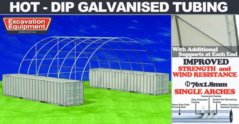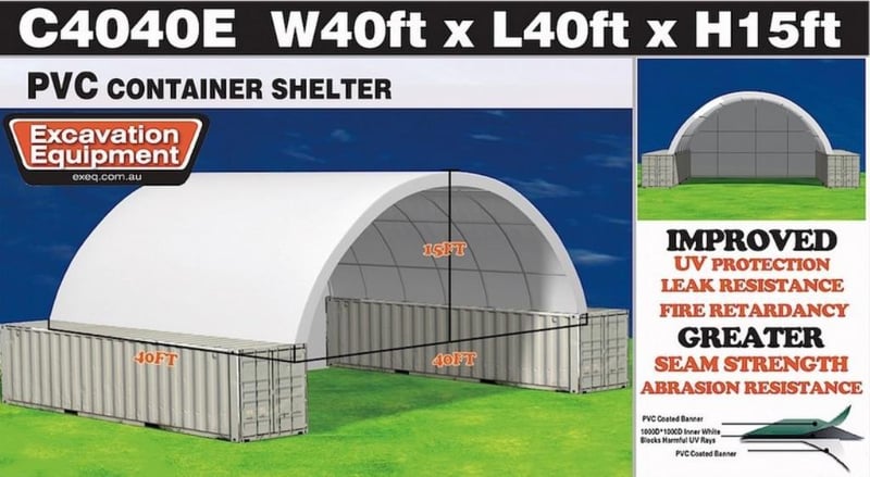 Unused Heavy duty 40ft Container Shelter with End wall, Model: C4040E, 40ft wide x 40ft long x 15ft High, Heavy duty PVC fabric, galvanised tube frame, Approximate Shipping Dimensions: 2430mm L x 740mm W x 1280mm H, Approximate Weight: 1150kg