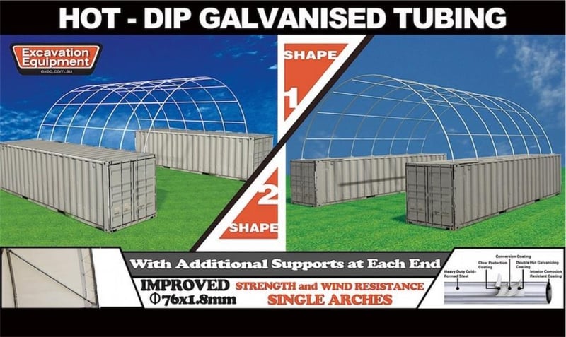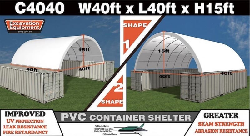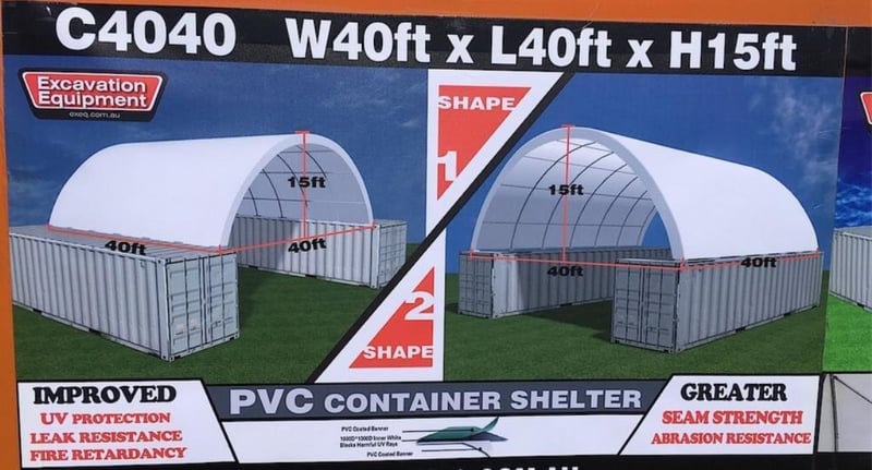 Unused Heavy duty 40ft Container Shelter, Model: C4040, 40ft wide x 40ft long x 15ft High, Heavy duty PVC fabric, galvanised tube frame, Approximate Shipping Dimensions: 2440mm L x 740mm W x 1150mm H, Approximate Weight: 900kgLocation: Muchea, Perth WARef: 168102