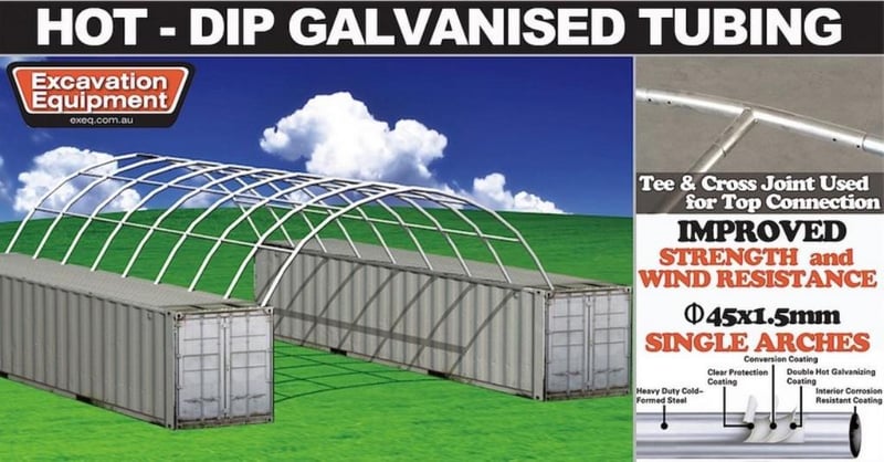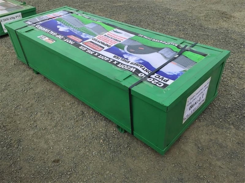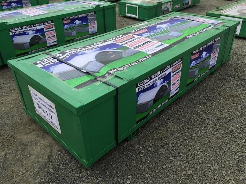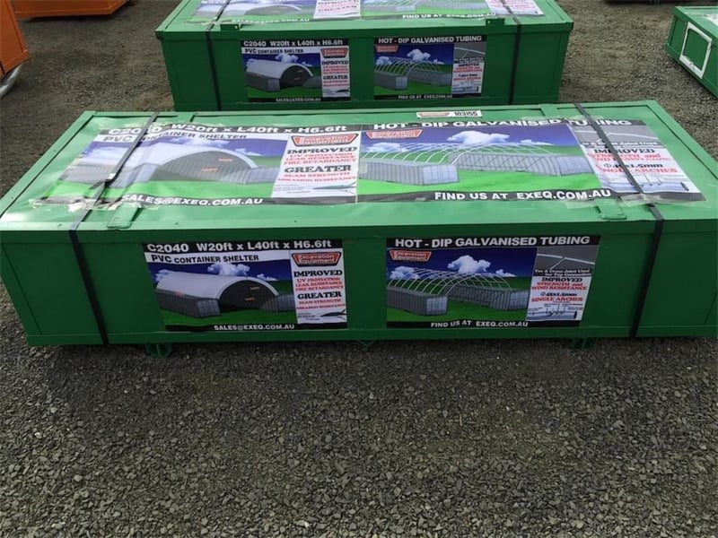 Unused Heavy duty 40ft Container Shelter, Model: C2040 - 20ft wide, No end wall, 40ft long x 6ft 6in High, Heavy duty PVC fabric, Galvanised tube frame, Approximate Shipping Dimensions: 1930mm L x 750mm W x 480mm H, Approximate Weight: 328kg