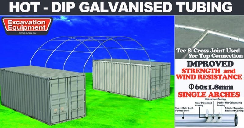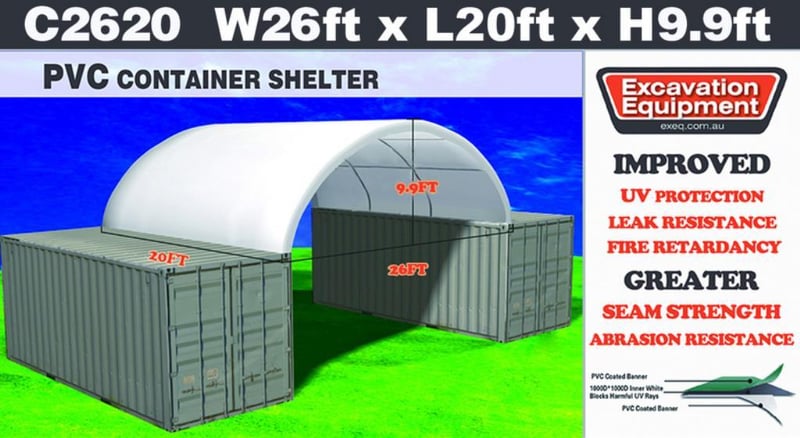 Unused Heavy Duty 20ft Container Shelter No End Wall, Model: C2620 - 26ft Wide, 20ft long x 26ft wide x 9ft 9in high, Heavy duty PVC fabric, Galvanised tube frame, Shipping Dimensions: 2685mm L x 740mm W x 460mm HWeight: 355kgsLocation: Muchea, Perth WARef: 162644