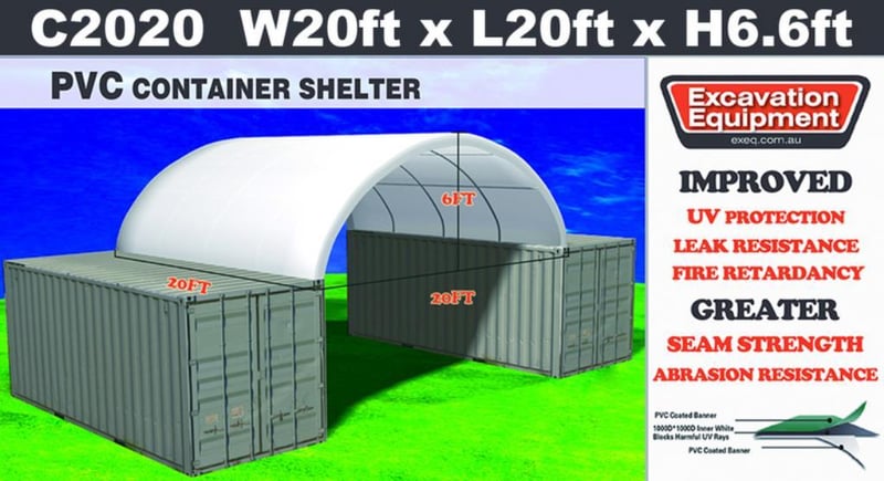 Unused Heavy duty 20ft Container Shelter, Model: C2020, 20ft wide x 20ft long x 6ft 6in high container shelter, heavy duty PVC fabric, galvanised tube frame, Approximate Shipping dimensions: 1930mm L x 740mm W x 340mm H, Approximate Weight: 220kg