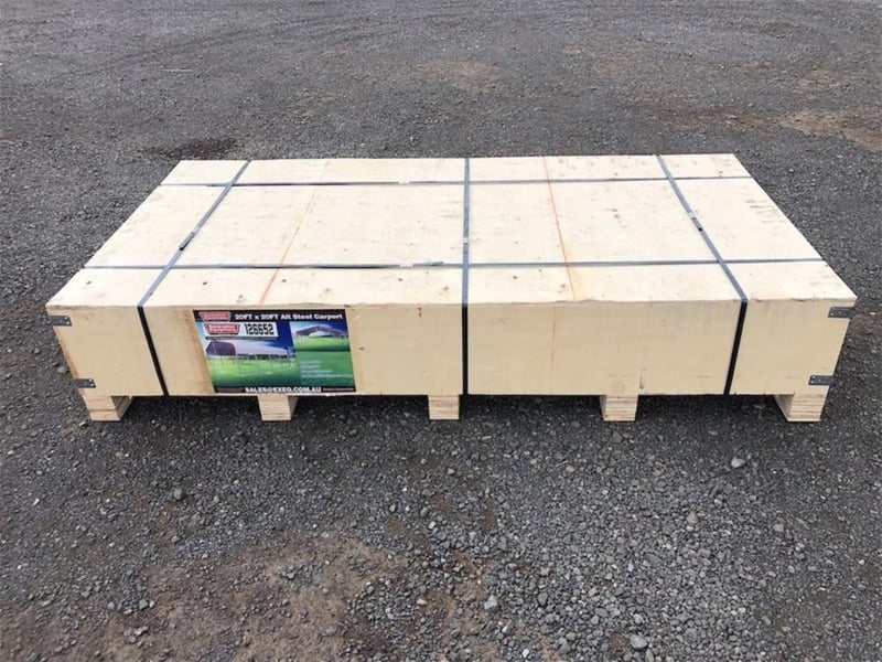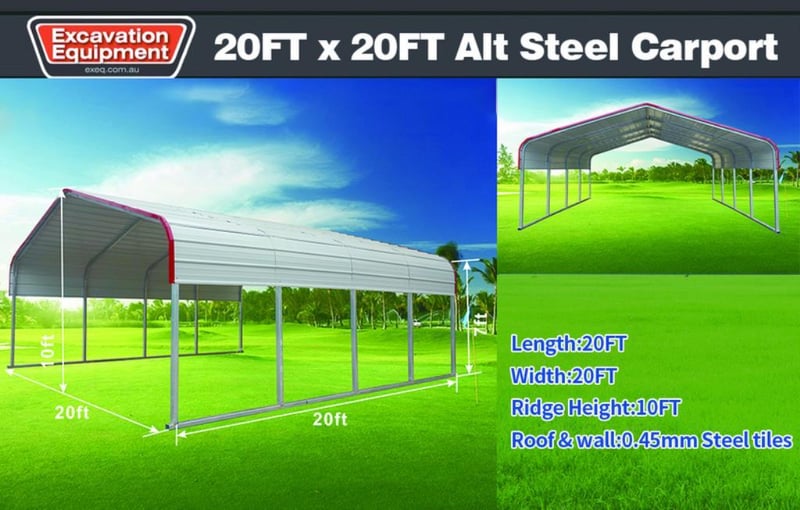 Unused 20ft x 20ft Steel Carport, 20ft Long x 20ft Wide x 10ft High, Approximate Shipping Dimensions : 2220mm L x 1130mm W x 430mm H, Approximate Weight: 550kg