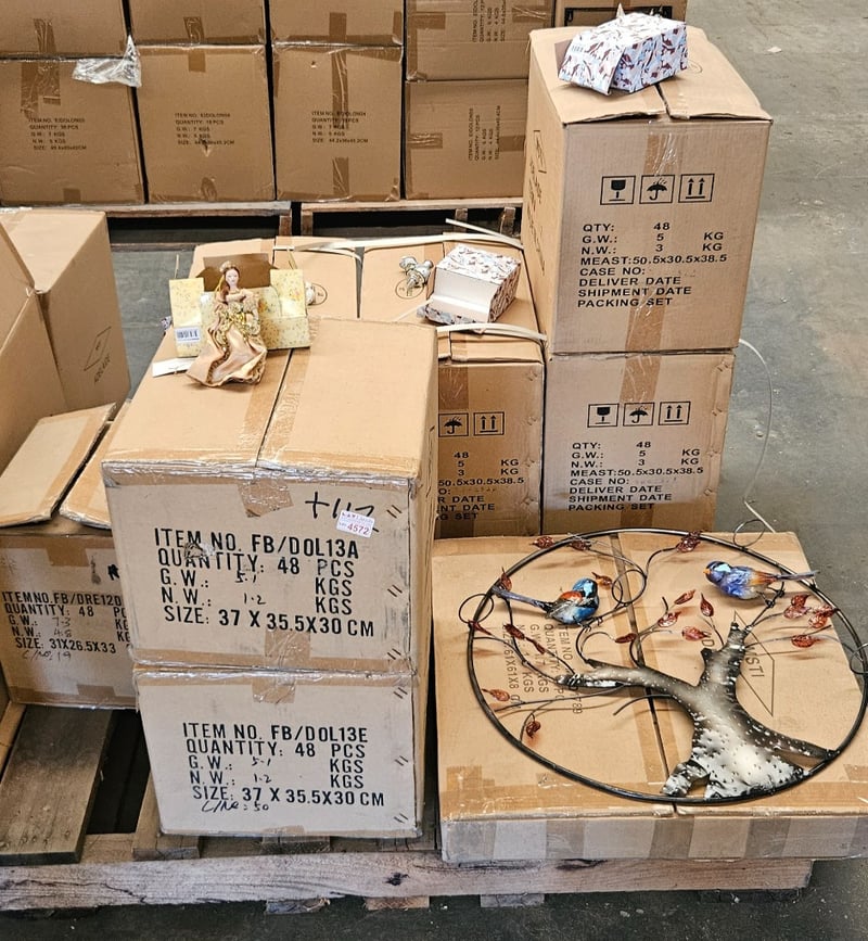 **UNRESERVED** Giftware, Pallet of Assorted Items Including Shoe Style Perfume Bottles, Steel Style Garden Art with Birds and moreSold as lot