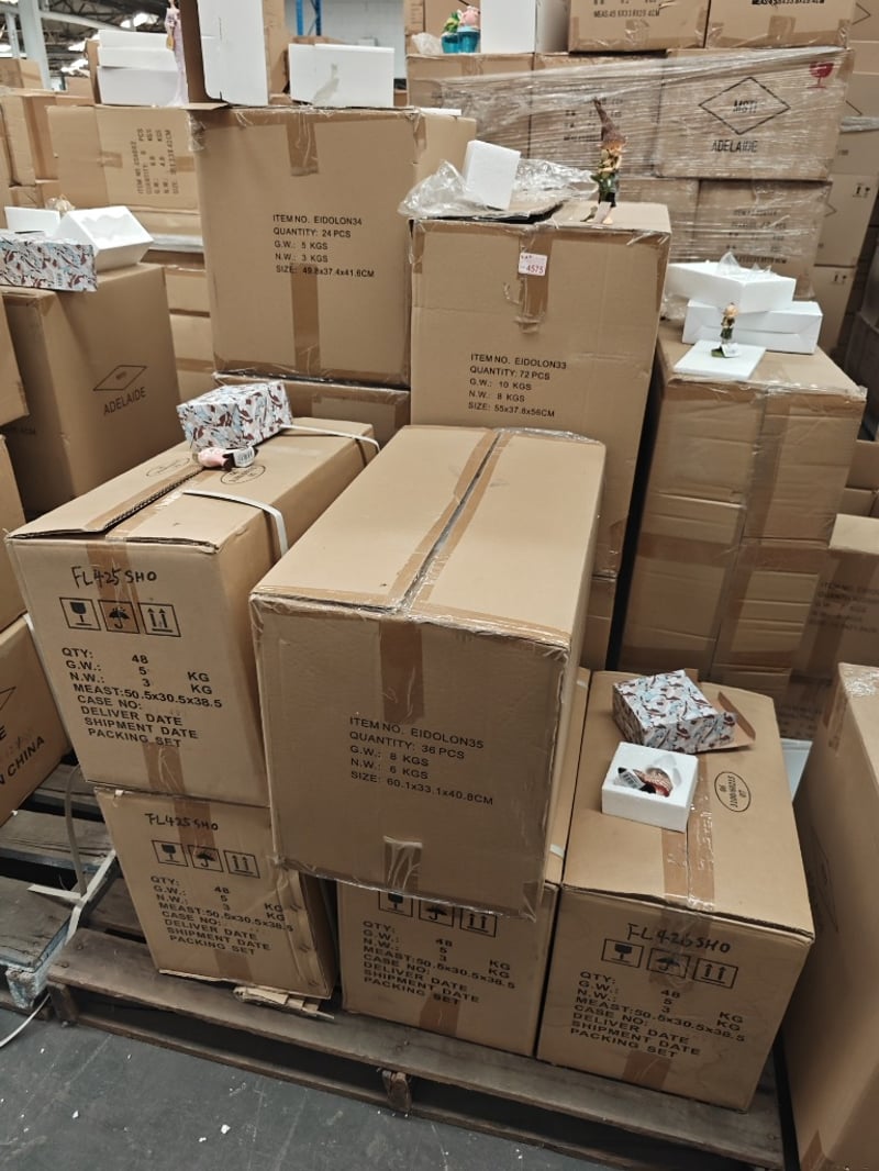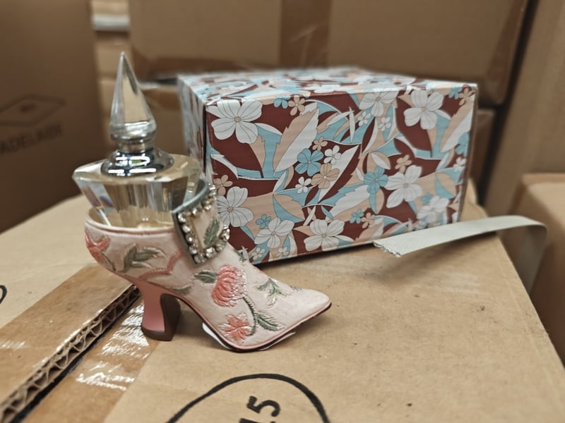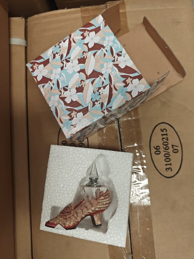 **UNRESERVED** Giftware, Pallet of Assorted items including perfume bottle, and elf style ornaments Sold as lot