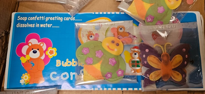 **UNRESERVED** Giftware, Assorted Items Including Soap Confetti Greeting Cards and Animated Containers.Sold as lot