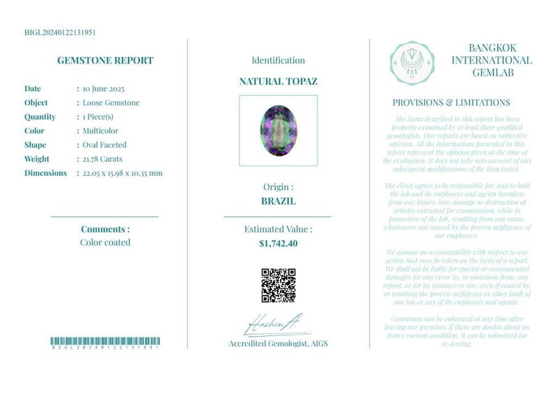 21.78 CARATS CERTIFIED NATURAL TOPAZ Gemstone : Natural TopazCertificate Number : Bigl20240122131951Weight : 21.78 CaratsColor : MulticolorMeasurement : 22.05 X 15.98 X 10.35 MmShape : Oval FacetedQuantity : 1 PieceOrigin : BrazilComments : Color Coated• Use The Qr Code On The Packaging To View And Download The Certificate. • Verify Report Online At Www.Bangkokinternationalgemlab.Co Condition: Good - Refer Images 01611160+16