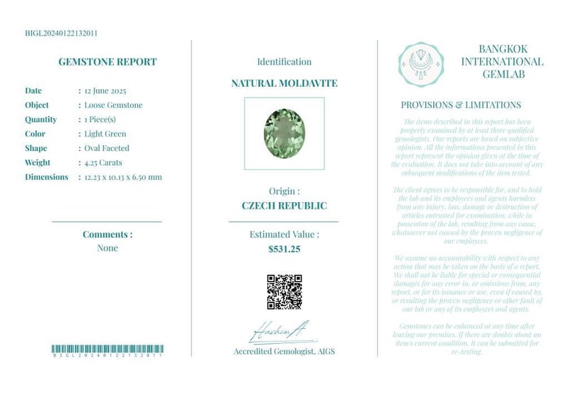 4.25 CARATS CERTIFIED NATURAL MOLDAVITE Gemstone : Natural MoldaviteCertificate Number : Bigl20240122132011Weight : 4.25 CaratsColor : Light GreenMeasurement : 12.23 X 10.13 X 6.50 MmShape : Oval FacetedQuantity : 1 PieceOrigin : Czech RepublicComments : None• Use The Qr Code On The Packaging To View And Download The Certificate. • Verify Report Online At Www.Bangkokinternationalgemlab.Co Condition: Good - Refer Images 01611160+20
