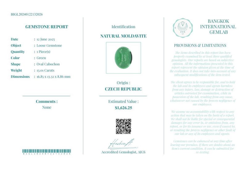 13.01 CARATS CERTIFIED NATURAL MOLDAVITE Gemstone : Natural MoldaviteCertificate Number : Bigl20240122132026Weight : 13.01 CaratsColor : GreenMeasurement : 16.85 X 13.32 X 8.86 MmShape : Oval CabochonQuantity : 1 PieceOrigin : Czech RepublicComments : None• Use The Qr Code On The Packaging To View And Download The Certificate. • Verify Report Online At Www.Bangkokinternationalgemlab.Co Condition: Good - Refer Images 01611160+21