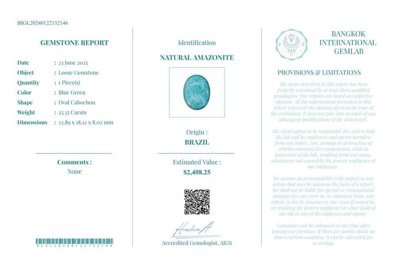 25.35 CARATS CERTIFIED NATURAL AMAZONITE Gemstone : Natural AmazoniteCertificate Number : Bigl20240122132146Weight : 25.35 CaratsColor : Blue GreenMeasurement : 23.89 X 18.12 X 8.02 MmShape : Oval CabochonQuantity : 1 PieceOrigin : BrazilComments : None• Use The Qr Code On The Packaging To View And Download The Certificate. • Verify Report Online At Www.Bangkokinternationalgemlab.Co Condition: Good - Refer Images 01611160+29