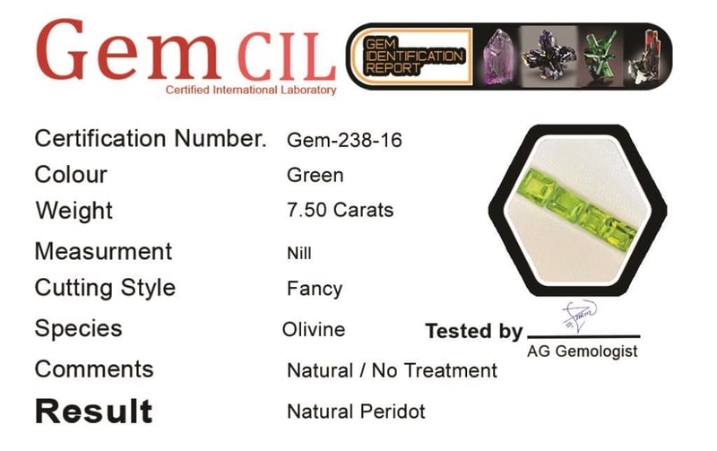 7.50 CARATS NATURAL LUSTROUS PERIDOT 7.50 Carats Natural Lustrous PeridotStone = Natural PeridotWeight = 7.50 CaratsColour = Green Cut = Fancy Note = Gem Cil, Certified, Precise Custom Cut (Not Commercial) Condition: Good - Refer Images 0488464+16