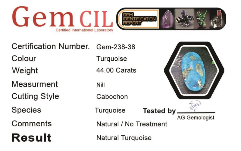 44.00 CARATS NATURAL QUALITY TURQUOISE 44.00 Carats Natural Quality Turquoise Stone = Natural TurquoiseWeight = 44.00 Carats Cut = Cabochon Colour = TurquoiseQuantity = 1Note = Gem Cil, Certified, Condition: Good - Refer Images 0488464+38