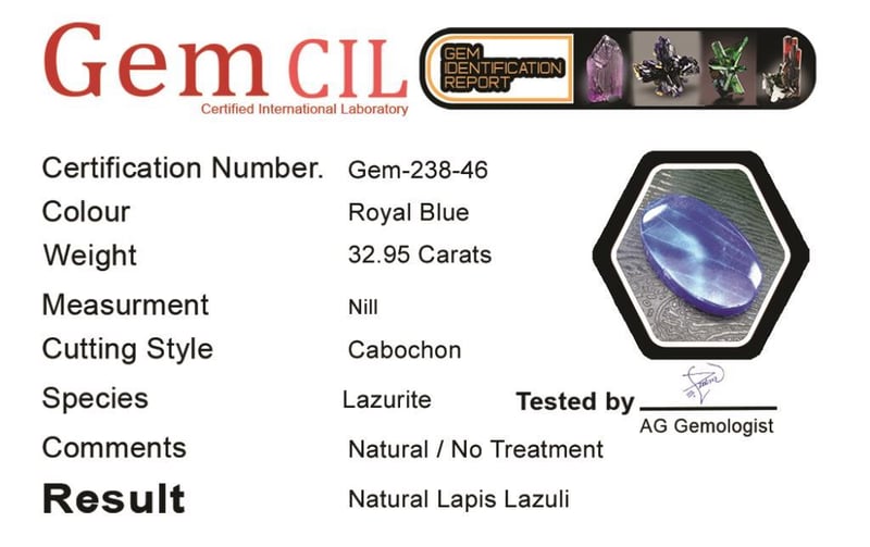 32.95 CARATS NATURAL ROYAL BLUE LAPIS LAZULI 32.95 Carats Natural Royal Blue Lapis Lazuli Stone = Natural Royal Blue Lapis LazuliWeight = 32.95 CaratsTreatment = Natural (Not Dyed) Cut = Cabochon Note = Gem Cil, Certified, Condition: Good - Refer Images 0488464+46