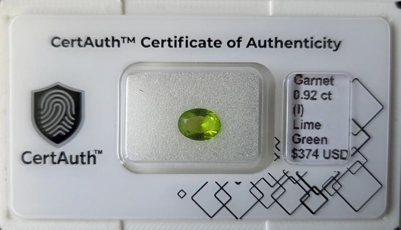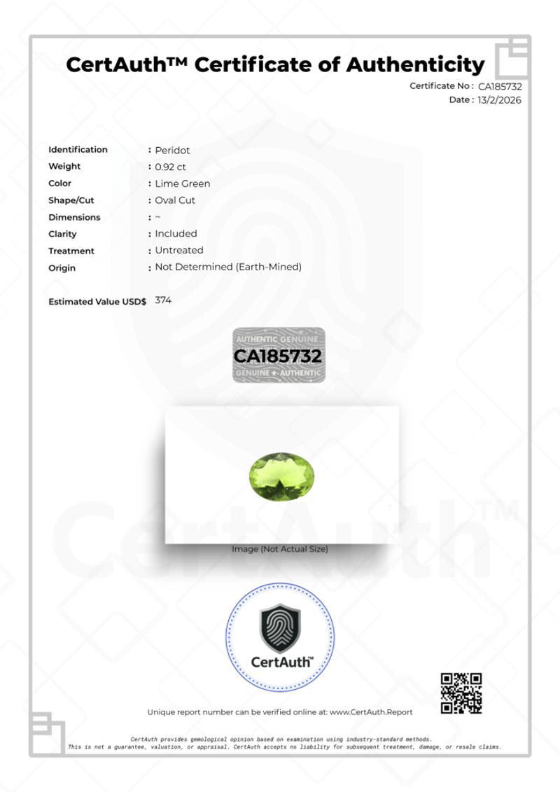 NATURAL 0.92CT LIME GREEN PERIDOT OVAL CUT – UNTREATED WITH CERTAUTH CERTIFICATE This Natural Peridot Displays A Vibrant Lime Green Colour And Is Cut In A Classic Oval Shape. Weighing 0.92 Carats, The Stone Shows Visible Inclusions Typical Of Natural Peridot And Remains Completely Untreated. This Earth-Mined Gemstone Is Accompanied By A Certauth Digital Certificate For Verification.• Gemstone: Peridot• Carat Weight: 0.92 Ct• Colour: Lime Green• Cut: Oval Cut• Dimensions: Not Provided• Clarity: Included• Treatment: Untreated• Origin: Not Determined (Earth-Mined)• Certification: Certauth Digital Certificate (Ca185732)• Estimated Value: $374 Usd Condition: Good - Refer Images 0488482+4
