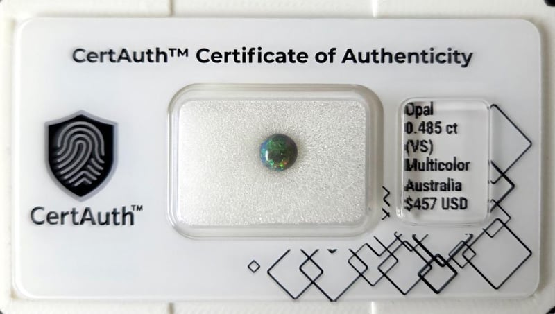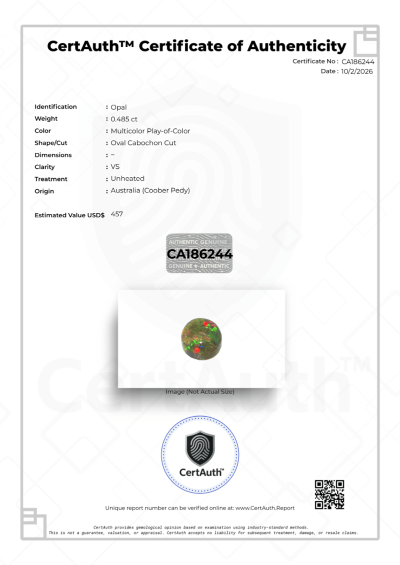 NATURAL 0.485CT AUSTRALIAN OPAL OVAL CABOCHON CUT – UNHEATED (COOBER PEDY) WITH CERTAUTH CERTIFICATE This Natural Australian Opal Displays Vibrant Multicolour Play-Of-Colour And Is Fashioned In An Oval Cabochon Cut. Weighing 0.485 Carats With Vs Clarity, This Earth-Mined Gemstone Is Unheated And Sourced From Coober Pedy, Australia. The Stone Includes A Certauth Digital Certificate For Secure Verification.• Gemstone: Opal• Carat Weight: 0.485 Ct• Colour: Multicolor Play-Of-Color• Cut: Oval Cabochon Cut• Dimensions: Not Provided• Clarity: Vs• Treatment: Unheated• Origin: Australia (Coober Pedy)• Certification: Certauth Digital Certificate (Ca186244)• Estimated Value: $457 Usd Condition: Good - Refer Images 0488482+6