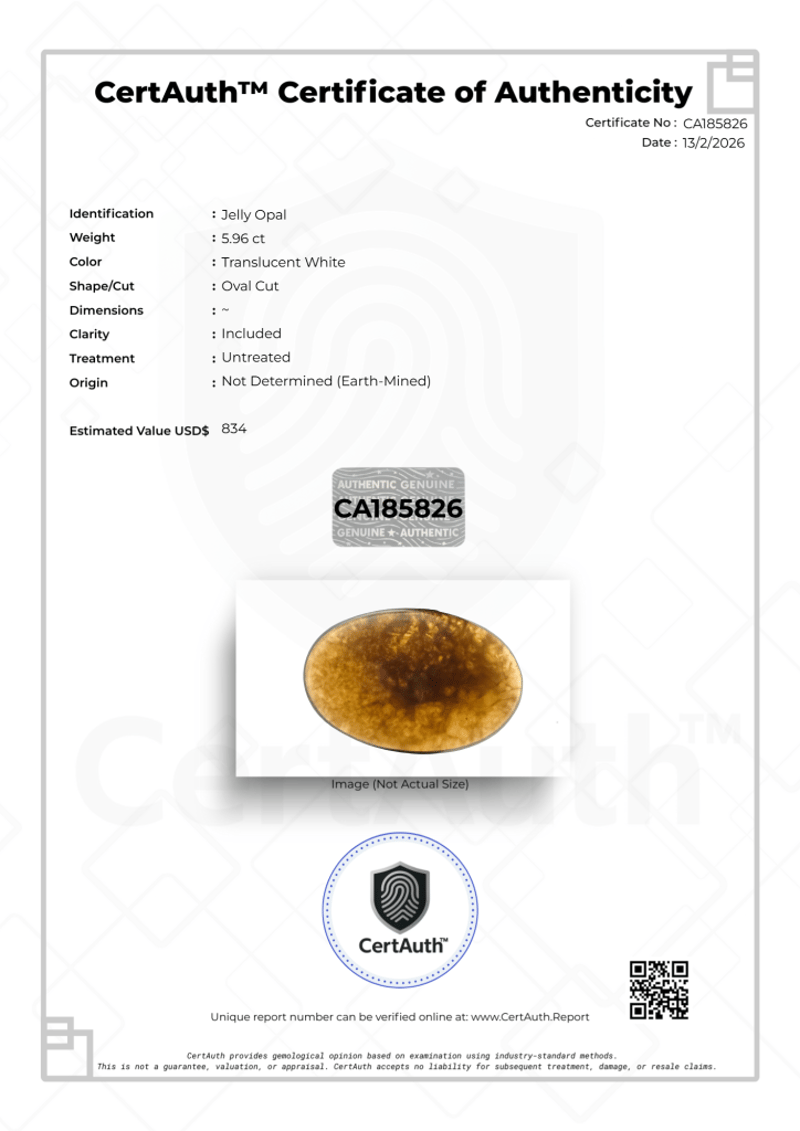 NATURAL 5.96CT JELLY OPAL OVAL CUT – UNTREATED WITH CERTAUTH CERTIFICATE This Natural Jelly Opal Displays A Translucent White Body Tone And Is Fashioned In An Oval Cut. Weighing 5.96 Carats, The Stone Shows Natural Inclusions Consistent With Its Formation And Remains Completely Untreated. This Earth-Mined Gemstone Includes A Certauth Digital Certificate For Secure Verification.• Gemstone: Jelly Opal• Carat Weight: 5.96 Ct• Colour: Translucent White• Cut: Oval Cut• Dimensions: Not Provided• Clarity: Included• Treatment: Untreated• Origin: Not Determined (Earth-Mined)• Certification: Certauth Digital Certificate (Ca185826)• Estimated Value: $834 Usd Condition: Good - Refer Images 0488482+9