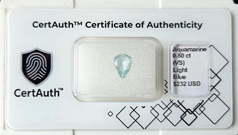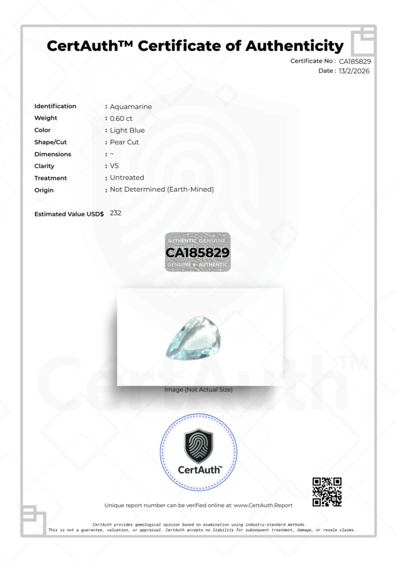 NATURAL 0.60CT AQUAMARINE PEAR CUT – UNHEATED WITH CERTAUTH CERTIFICATE This Natural Aquamarine Displays A Light Blue Colour And Is Cut In A Classic Pear Shape. Weighing 0.60 Carats, The Stone Shows Very Good Clarity Graded Vs And Remains Unheated. This Earth-Mined Gemstone Includes A Certauth Digital Certificate For Secure Verification.• Gemstone: Aquamarine• Carat Weight: 0.60 Ct• Colour: Light Blue• Cut: Pear Cut• Clarity: Vs• Treatment: Unheated• Origin: Not Determined (Earth-Mined)• Certification: Certauth Digital Certificate (Ca185829)• Estimated Value: $232 Usd Condition: Good - Refer Images 0488482+12