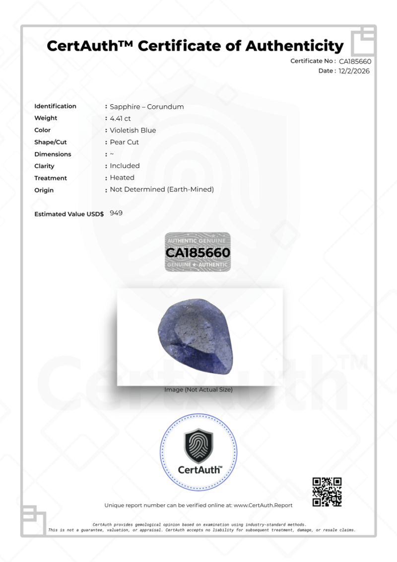 NATURAL 4.41CT VIOLETISH BLUE SAPPHIRE (CORUNDUM) PEAR CUT – HEATED – CERTAUTH CERTIFIED This Natural Sapphire (Corundum) Displays A Violetish Blue Colour And Is Cut In An Elegant Pear Shape. Weighing 4.41 Carats, The Stone Contains Visible Inclusions And Has Undergone Heat Treatment, A Standard And Widely Accepted Enhancement In Sapphires. This Earth-Mined Gemstone Includes A Certauth Digital Certificate For Verification.• Gemstone: Sapphire – Corundum• Carat Weight: 4.41 Ct• Colour: Violetish Blue• Cut: Pear Cut• Clarity: Included• Treatment: Heated• Origin: Not Determined (Earth-Mined)• Certification: Certauth Digital Certificate (Ca185660)• Estimated Value: $949 Usd Condition: Good - Refer Images 0488482+15