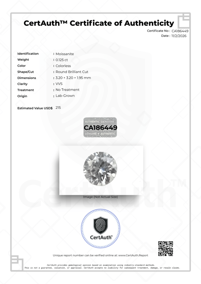 LAB-GROWN 0.125CT COLORLESS MOISSANITE ROUND BRILLIANT CUT – NO TREATMENT – CERTAUTH CERTIFIED This Lab-Grown Moissanite Is Completely Colorless And Precision Cut In A Classic Round Brilliant Style. Weighing 0.125 Carats, It Displays Exceptional Vvs Clarity And Has Not Undergone Any Treatment. A Certauth Digital Certificate Is Included For Secure Verification.• Gemstone: Moissanite• Carat Weight: 0.125 Ct• Colour: Colorless• Cut: Round Brilliant Cut• Dimensions: 3.20 × 3.20 × 1.95 Mm• Clarity: Vvs• Treatment: No Treatment• Origin: Lab-Grown• Certification: Certauth Digital Certificate (Ca186449)• Estimated Value: $215 Usd Condition: Good - Refer Images 0488482+19