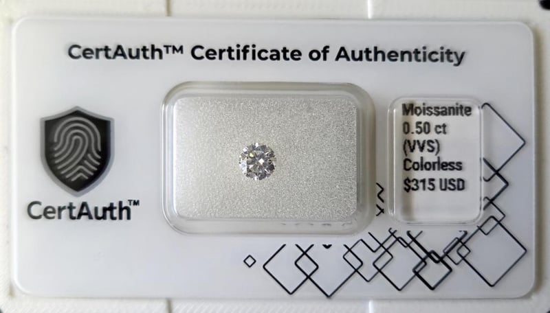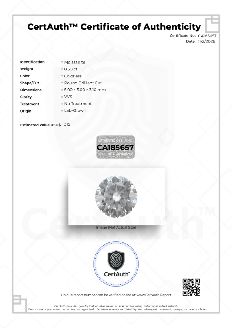 LAB-GROWN 0.50CT COLORLESS MOISSANITE ROUND BRILLIANT CUT – VVS – NO TREATMENT – CERTAUTH CERTIFIED A Precision-Cut Lab-Grown Moissanite Weighing 0.50 Carats, Featuring A Classic Round Brilliant Cut And Exceptional Vvs Clarity. This Colorless Stone Has Received No Treatment And Offers Outstanding Brilliance And Fire. Comes With A Certauth Digital Certificate For Verification.• Gemstone: Moissanite• Carat Weight: 0.50 Ct• Colour: Colorless• Cut: Round Brilliant Cut• Dimensions: 5.00 × 5.00 × 3.10 Mm• Clarity: Vvs• Treatment: No Treatment• Origin: Lab-Grown• Certification: Certauth Digital Certificate (Ca185657)• Estimated Value: $315 Usd Condition: Good - Refer Images 0488482+20