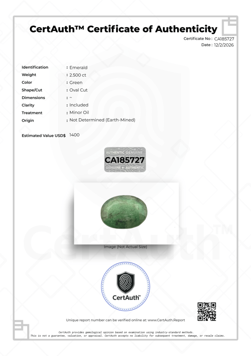 2.50CT EMERALD – GREEN – OVAL CUT – MINOR OIL – CERTAUTH CERTIFIED A Natural Emerald Weighing 2.50 Carats, Displaying A Classic Green Colour In An Elegant Oval Cut. The Stone Shows Typical Inclusions And Has Received Minor Oil Treatment, Common For Emeralds. Accompanied By A Certauth Digital Certificate For Verification.• Gemstone: Emerald• Carat Weight: 2.50 Ct• Colour: Green• Cut: Oval Cut• Dimensions: Not Provided• Clarity: Included• Treatment: Minor Oil• Origin: Not Determined (Earth-Mined)• Certification: Certauth Digital Certificate (Ca185727)• Estimated Value: $1400 Usd Condition: Good - Refer Images 0488482+24