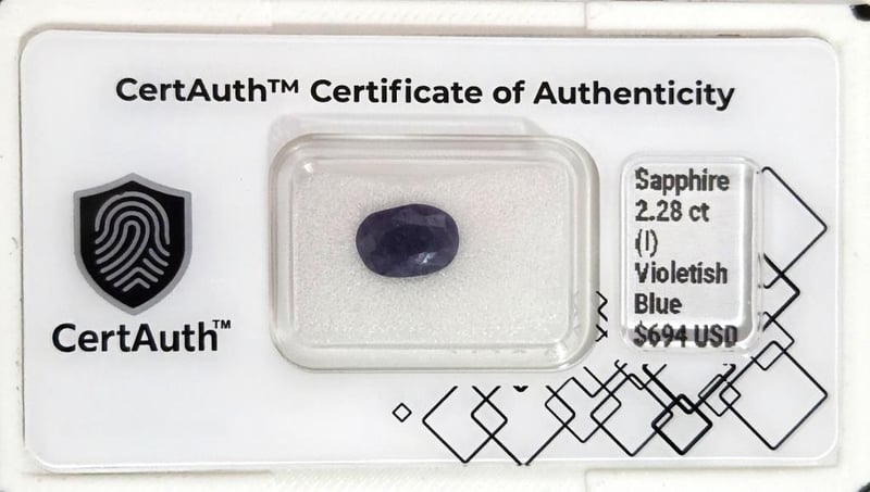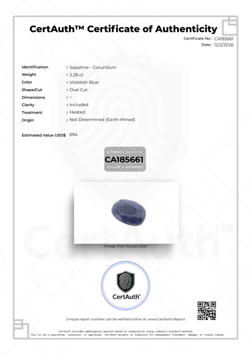 NATURAL 2.28CT VIOLETISH BLUE SAPPHIRE – OVAL CUT – HEATED – CERTAUTH CERTIFIED This Natural Sapphire (Corundum) Displays A Violetish Blue Colour And Is Cut In An Oval Shape. Weighing 2.28 Carats, This Earth-Mined Gemstone Has Undergone Heat Treatment And Is Accompanied By A Certauth Digital Certificate For Authentication.• Gemstone: Sapphire – Corundum• Carat Weight: 2.28 Ct• Colour: Violetish Blue• Cut: Oval Cut• Clarity: Included• Treatment: Heated• Dimensions: Not Provided• Origin: Not Determined (Earth-Mined)• Certification: Certauth Digital Certificate (Ca185661)• Estimated Value: $694 Usd Condition: Good - Refer Images 0488482+26