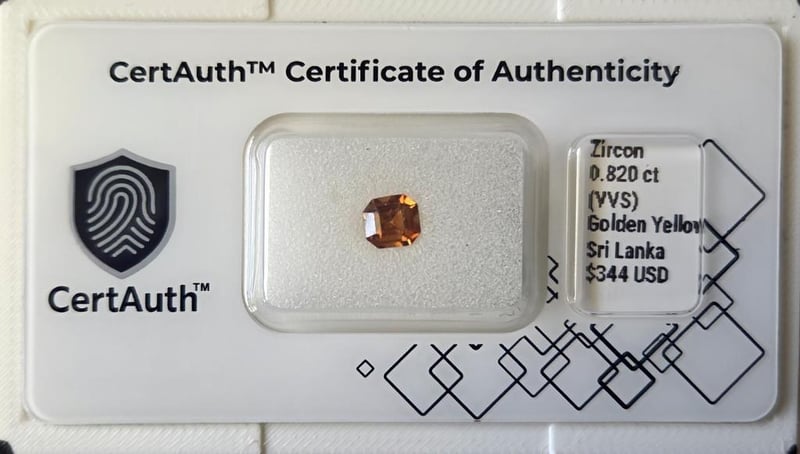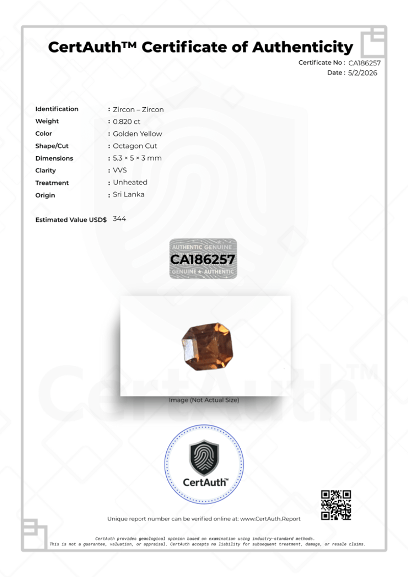 This Natural Zircon Features A Rich Golden Yellow Colour And Is Precision Cut In An Elegant Octagon Shape. Weighing 0.820 Carats, This Unheated Gemstone Originates From Sri Lanka And Displays Exceptional Vvs Clarity. Accompanied By A Certauth Digital Certificate For Authentication And Verification.