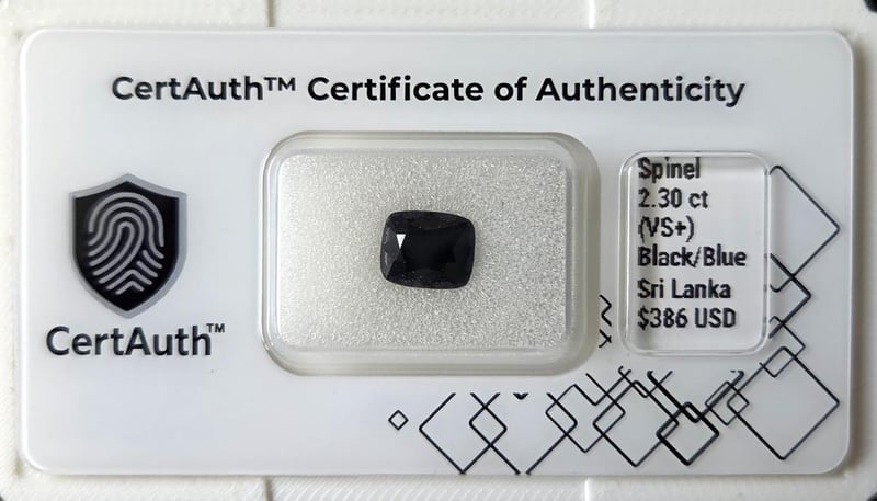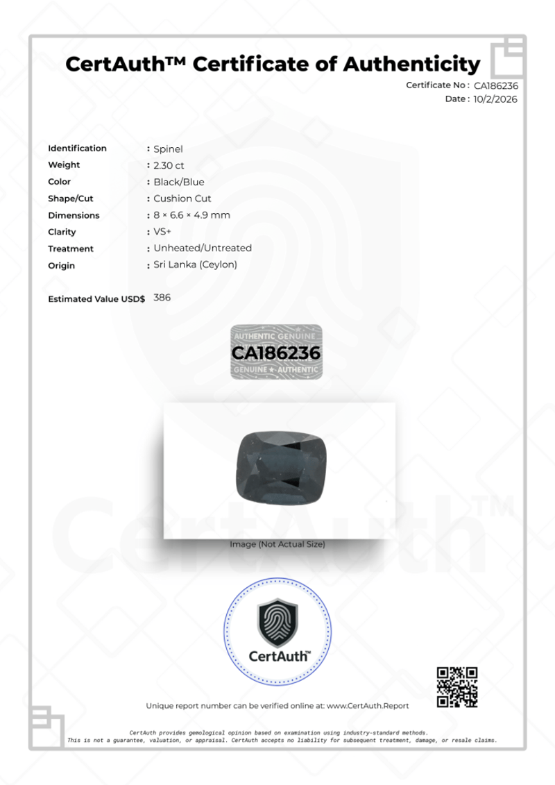 NATURAL 2.30CT BLACK/BLUE SPINEL – CUSHION CUT – VS+ – UNHEATED – SRI LANKA – CERTAUTH CERTIFIED This Natural Spinel Displays A Deep Black/Blue Body Colour With Strong Presence And Excellent Brilliance. Cut In A Refined Cushion Shape, It Weighs 2.30 Carats And Features Vs+ Clarity. This Gemstone Is Unheated And Originates From Sri Lanka (Ceylon). Accompanied By A Certauth Digital Certificate For Authentication And Verification.• Gemstone: Spinel• Carat Weight: 2.30 Ct• Colour: Black/Blue• Cut: Cushion Cut• Dimensions: 8 × 6.6 × 4.9 Mm• Clarity: Vs+• Treatment: Unheated/Untreated• Origin: Sri Lanka (Ceylon)• Certification: Certauth Digital Certificate (Ca186236)• Estimated Value: $386 Usd Condition: Good - Refer Images 0488482+30